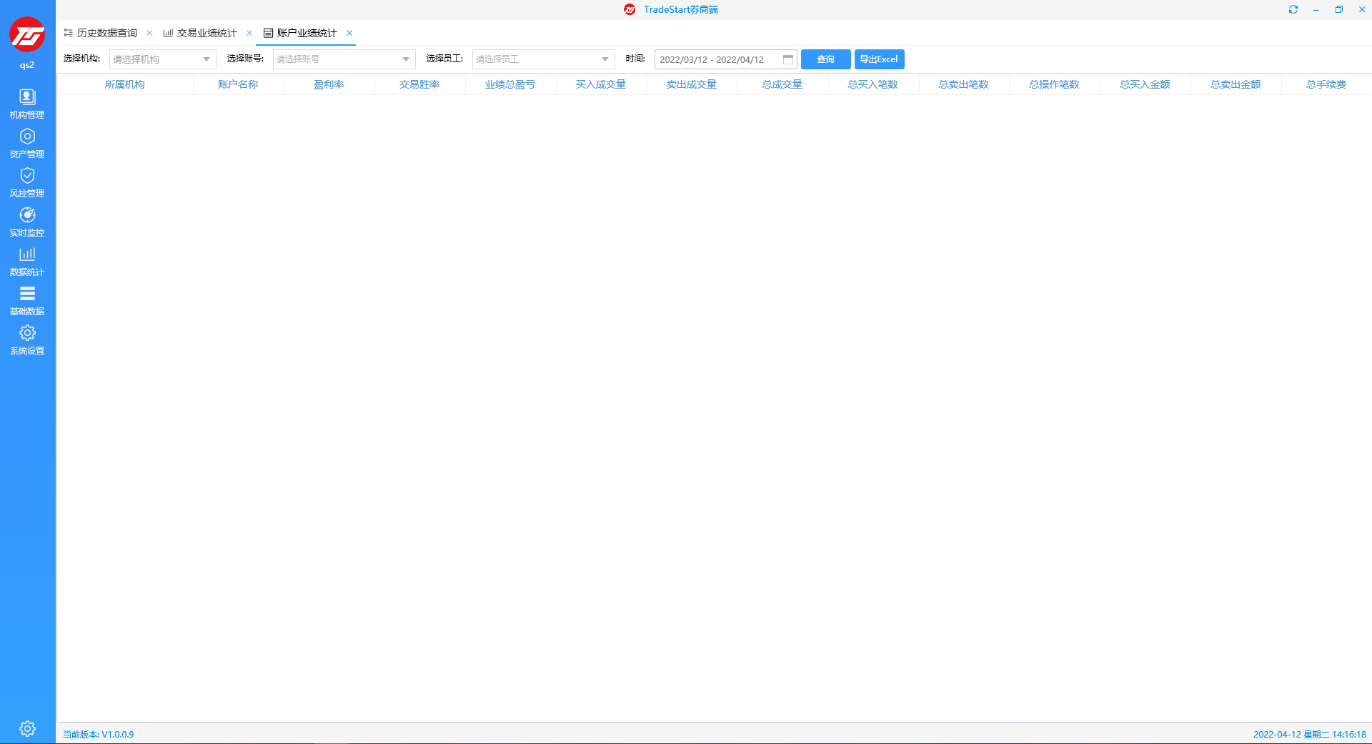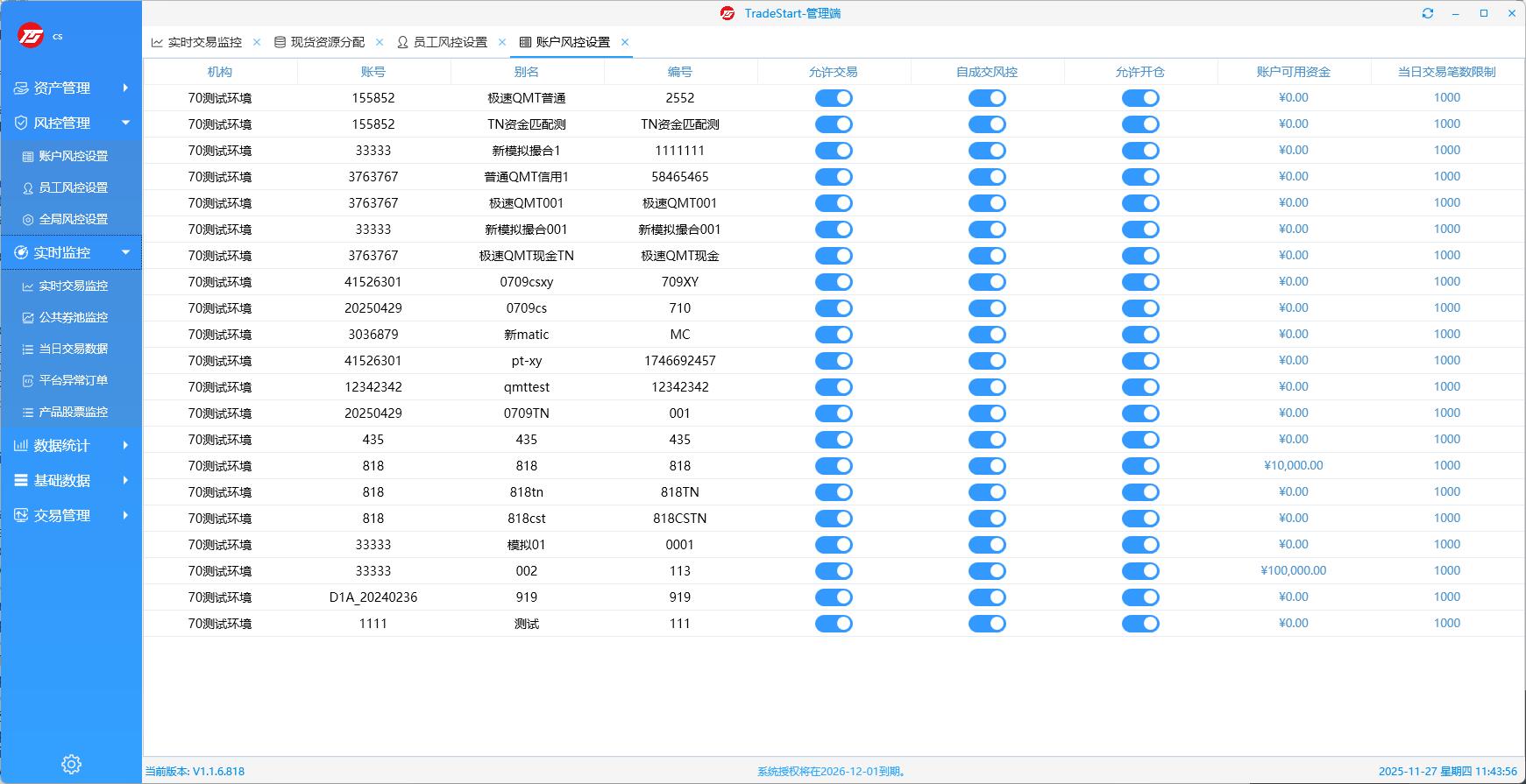 机构管理端的主要使用对象为机构管理员,机构管理员通过本系统可以对资金账户进行底仓分配、交易风控设置、业绩报表查看、交易实时监控等操作。